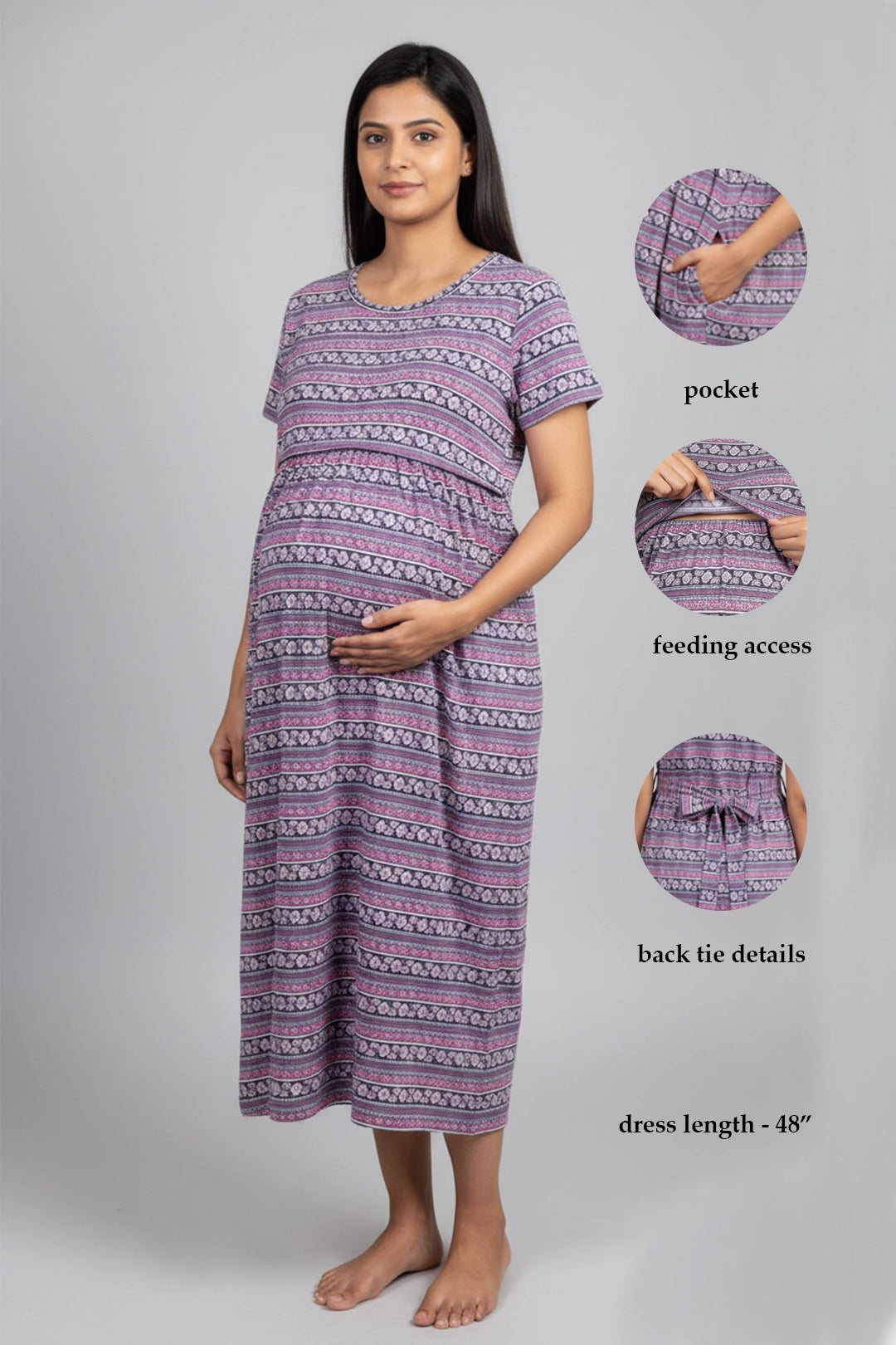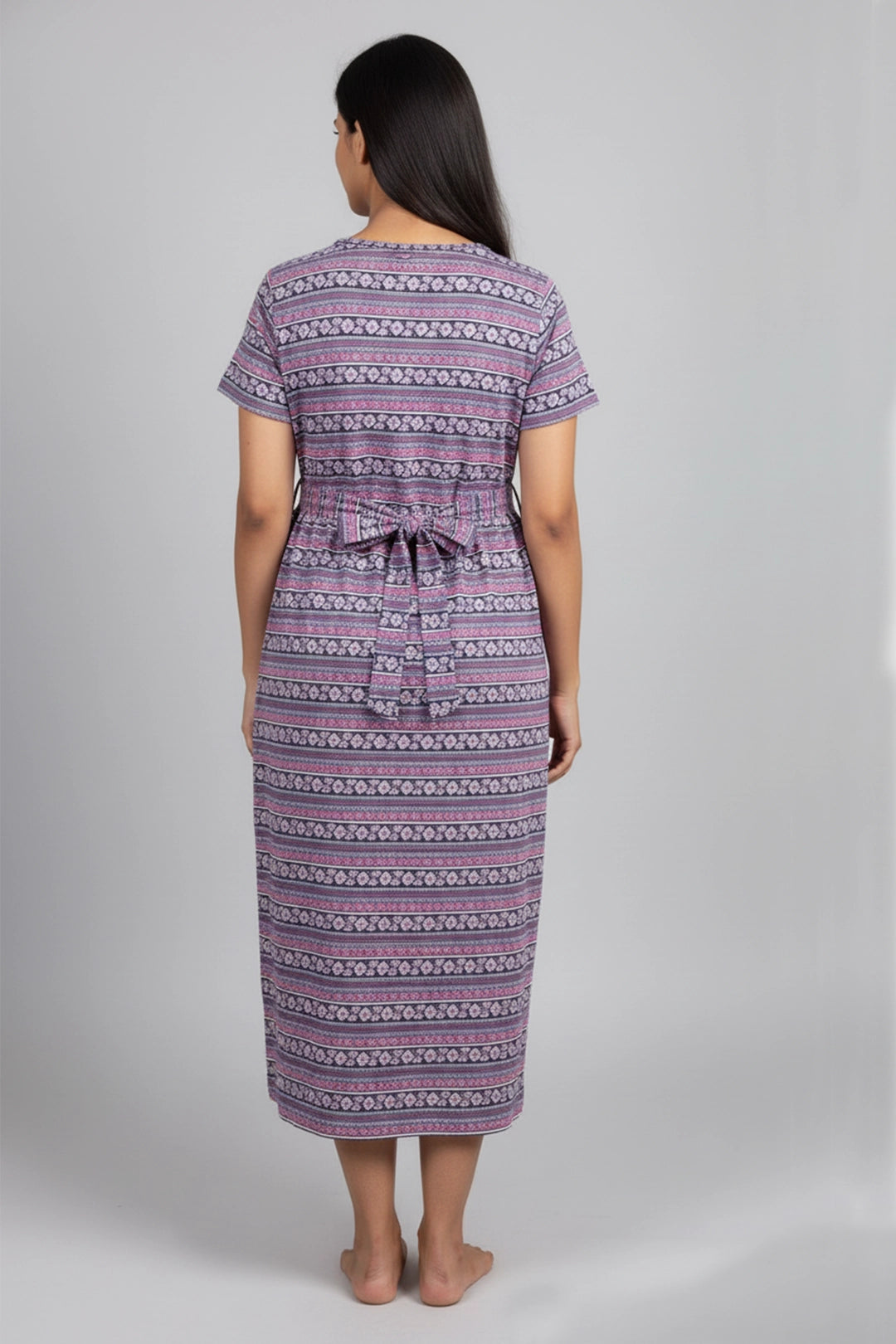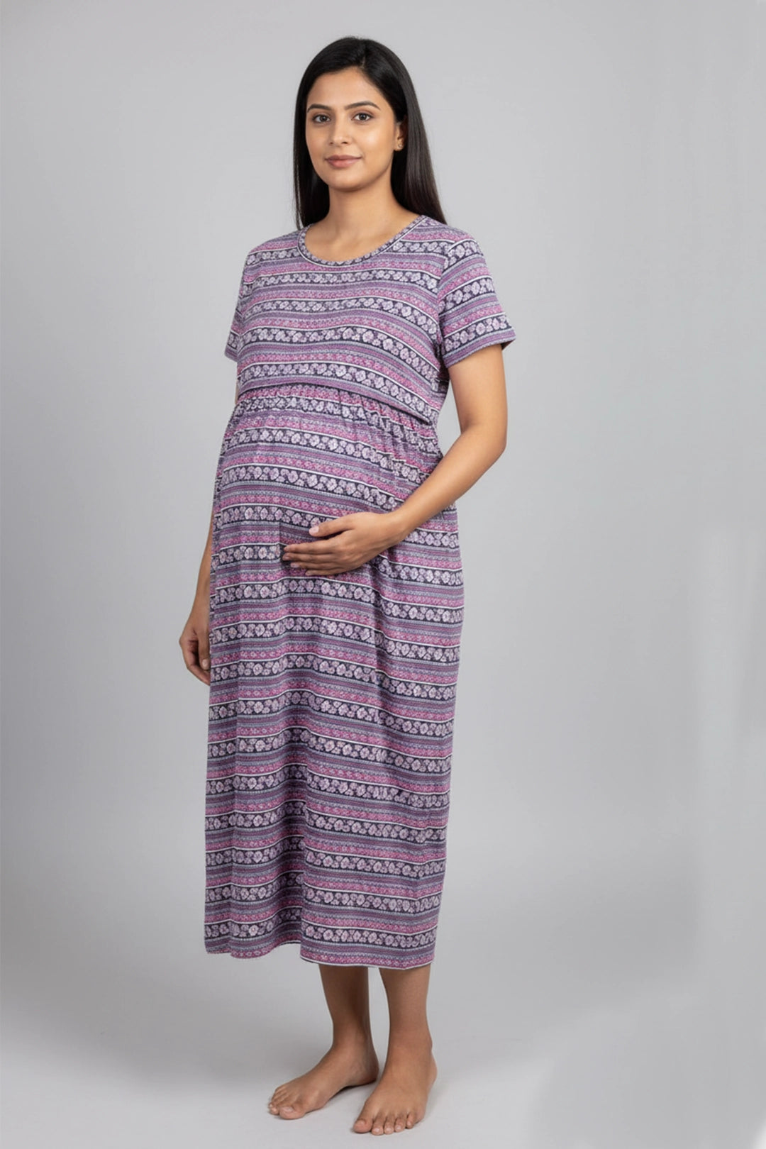 Geometric bloom Zipless Feeding Gown is where softness meets simplicity — thoughtfully crafted for slow mornings, relaxed afternoons, and every moment in between. Designed without zips or fuss, this piece gently supports you through pregnancy, postpartum, and nursing days, offering unmatched comfort with a quiet elegance.
