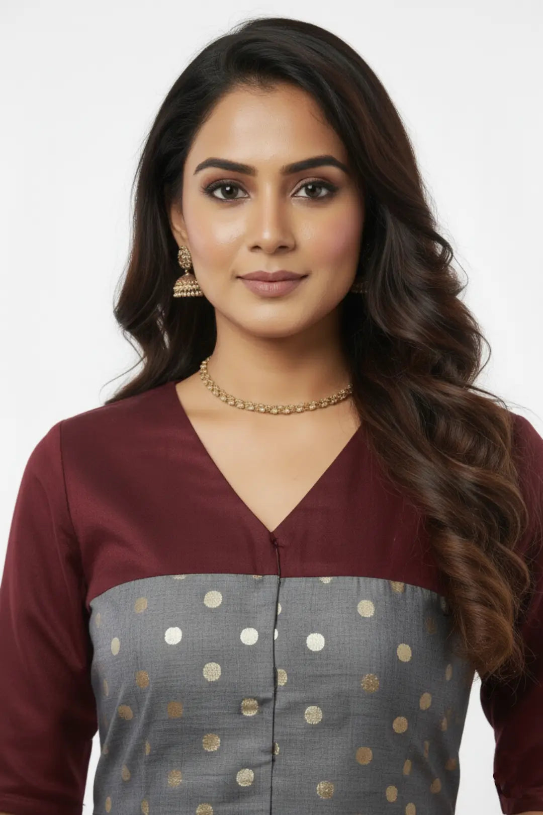 • Neckline: V neckline and contrast fabric at yoke, sleeve and skirt hem