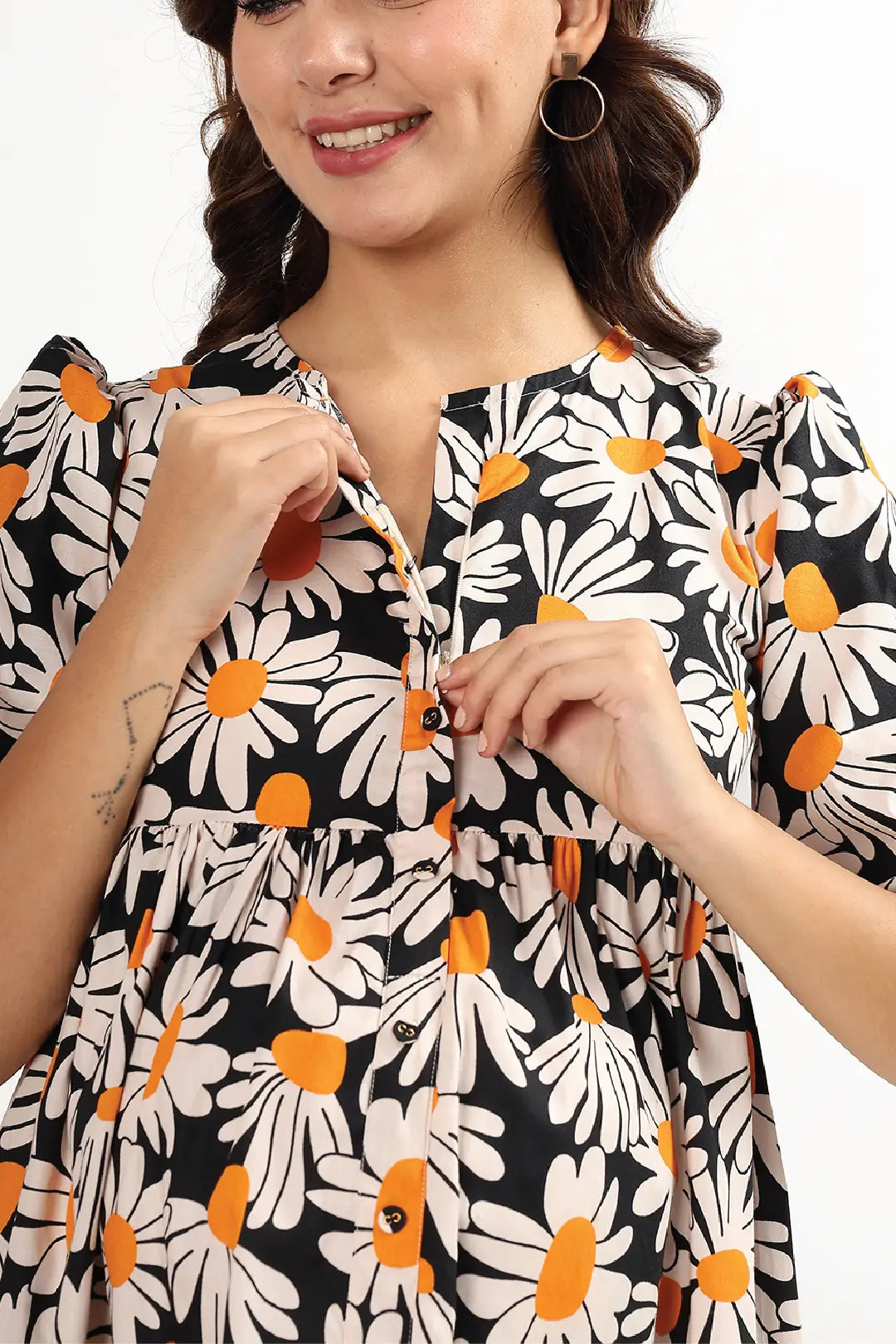 •     Fit: Relaxed A-line silhouette with tiered hem and button-down placket (designed to flatter all body types & growing bump)