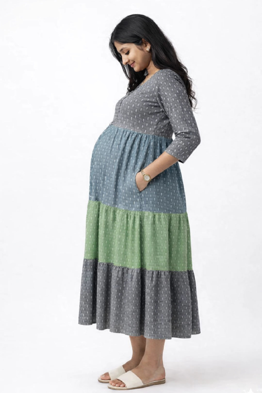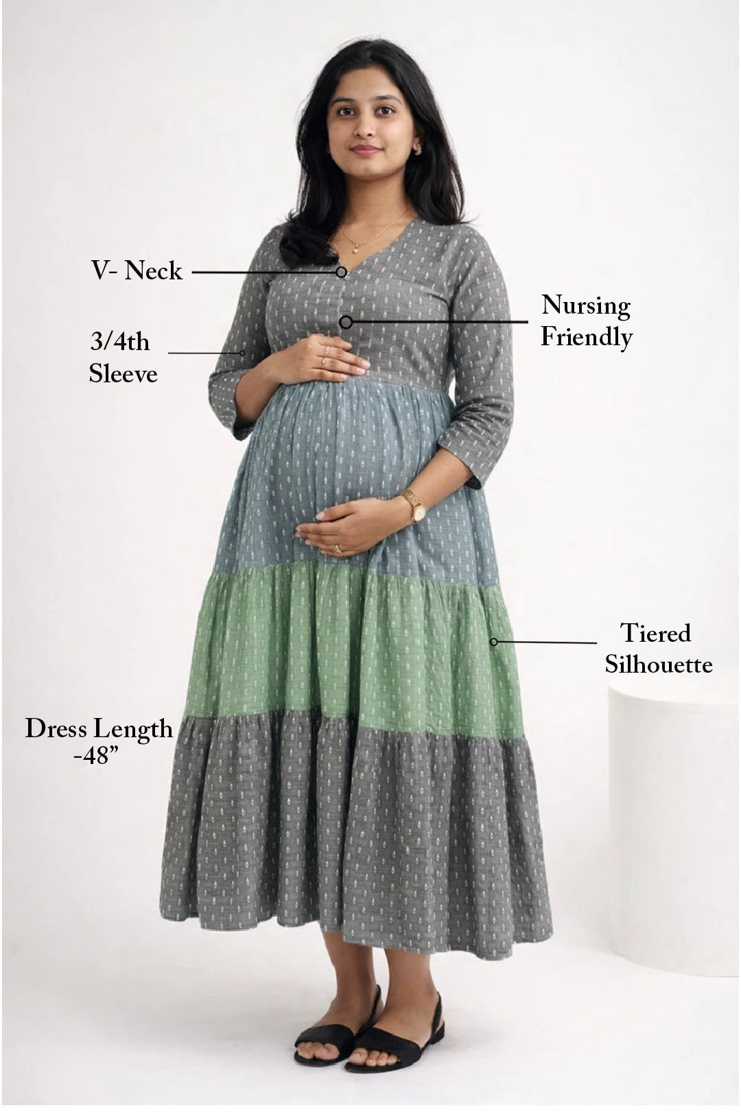 • Bump-Friendly: Tiered silhouette comfortably accommodates growing bellies while maintaining a flattering drape