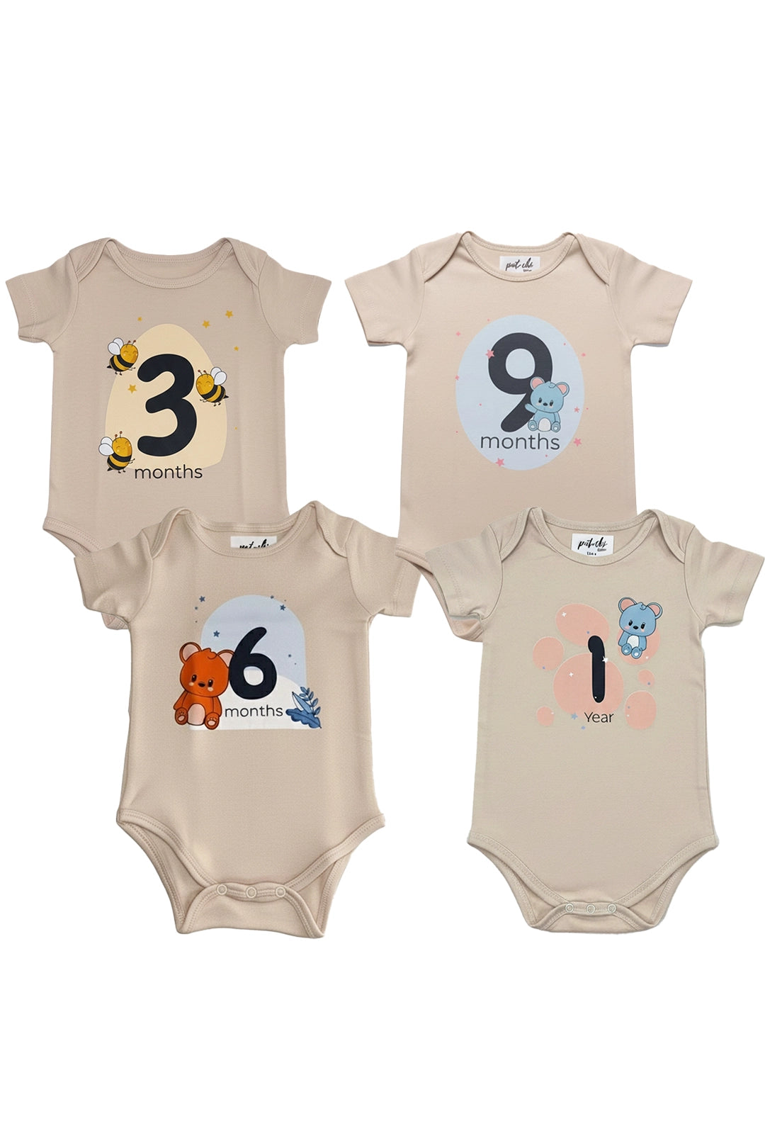 Set Includes: major milestone onesies like 3months, 6months, 9 months & 1year milestones