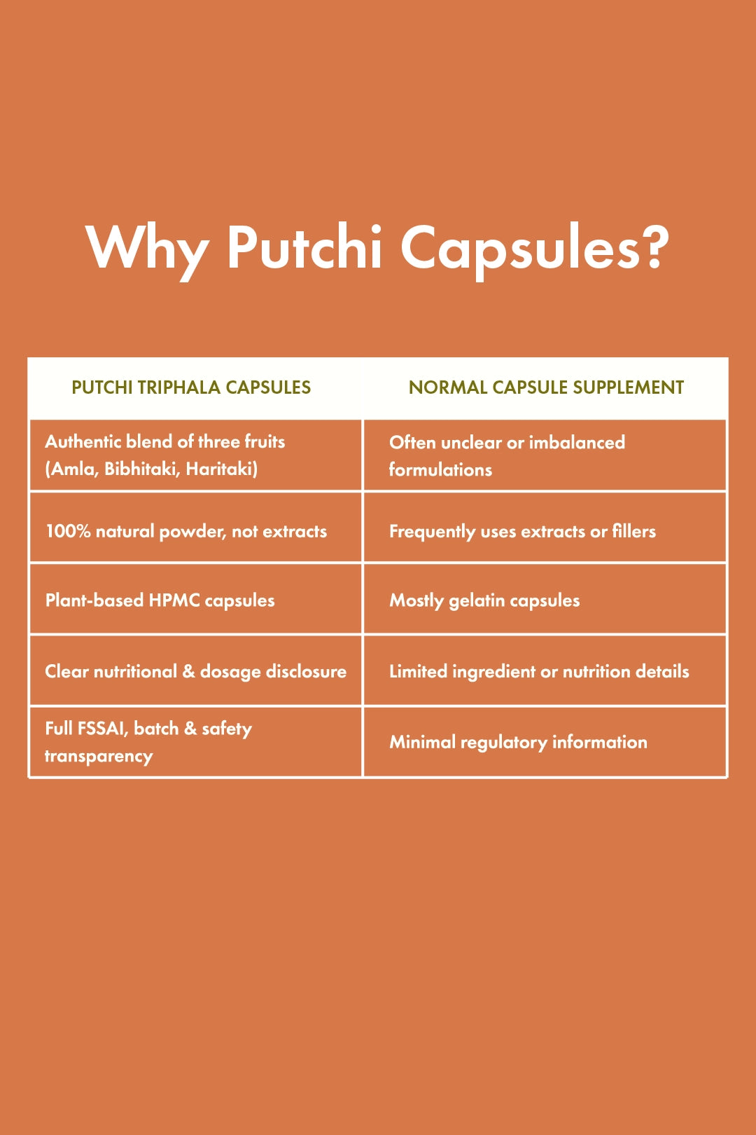 Putchi Triphala Capsules are plant-based, vegan-friendly, and ethically sourced, formulated with care to suit daily wellness routines. Designed for long-term use, this supplement is gentle on the stomach and free from harmful chemicals or artificial additives.