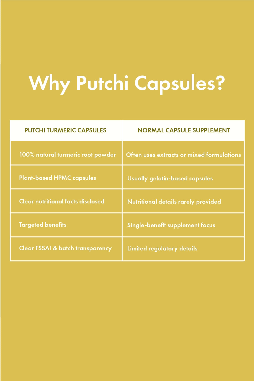 Putchi Turmeric Capsules are plant-based, vegan-friendly, and carefully processed to retain natural potency—free from unnecessary additives.