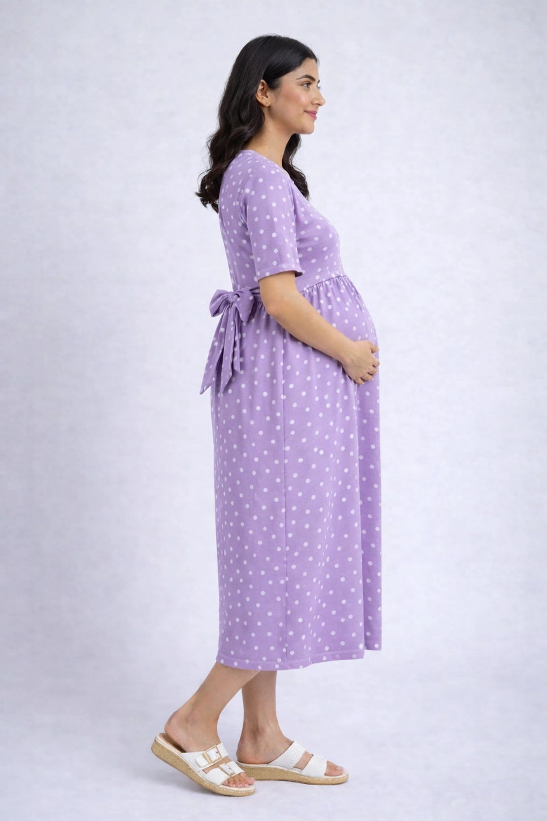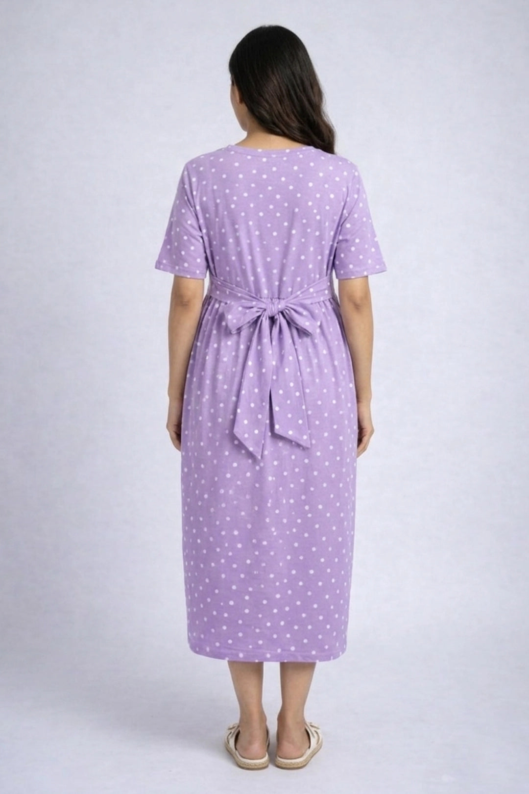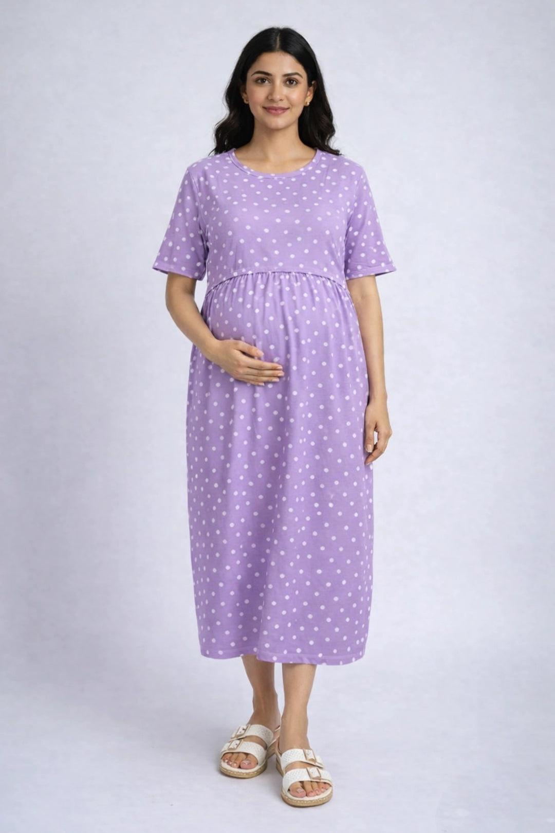 Orchid Polka zipless feeding gown – Lilac is where softness meets simplicity — thoughtfully crafted for slow mornings, relaxed afternoons, and every moment in between. Designed without zips or fuss, this piece gently supports you through pregnancy, postpartum, and nursing days, offering unmatched comfort with a quiet elegance.