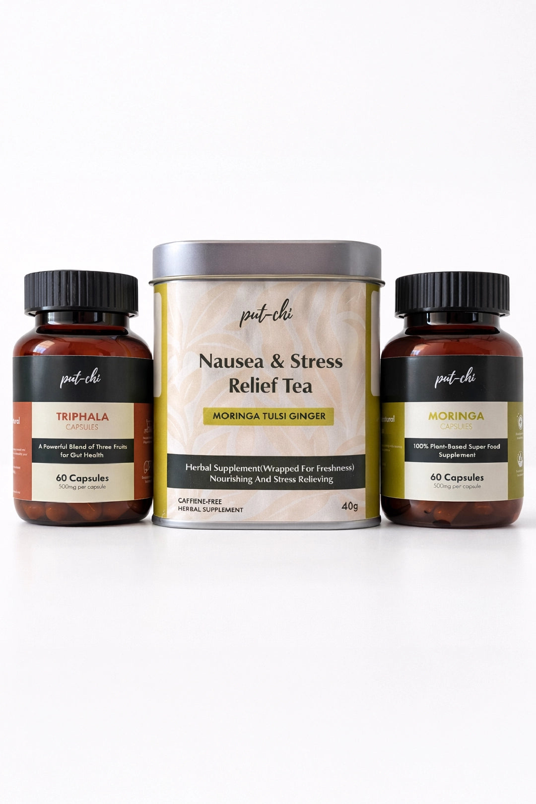 Reset your digestive system gently with the Putchi Gentle Detox & Gut Reset Kit, a thoughtfully curated wellness trio designed to support natural detoxification, digestive balance, and gut comfort. Combining the nourishing benefits of Moringa Capsules, the time-honoured digestive support of Triphala Capsules, and the soothing warmth of Moringa Ginger Herbal Tea, this plant-based kit helps you feel lighter, calmer, and more balanced—without harsh cleanses.