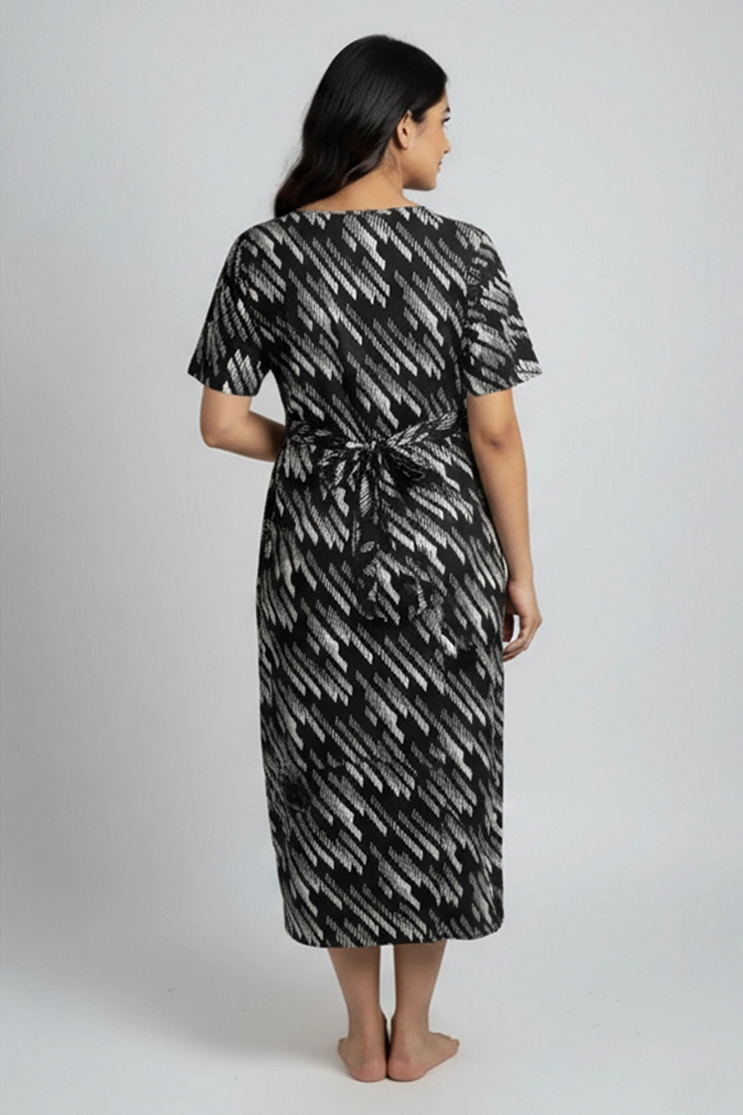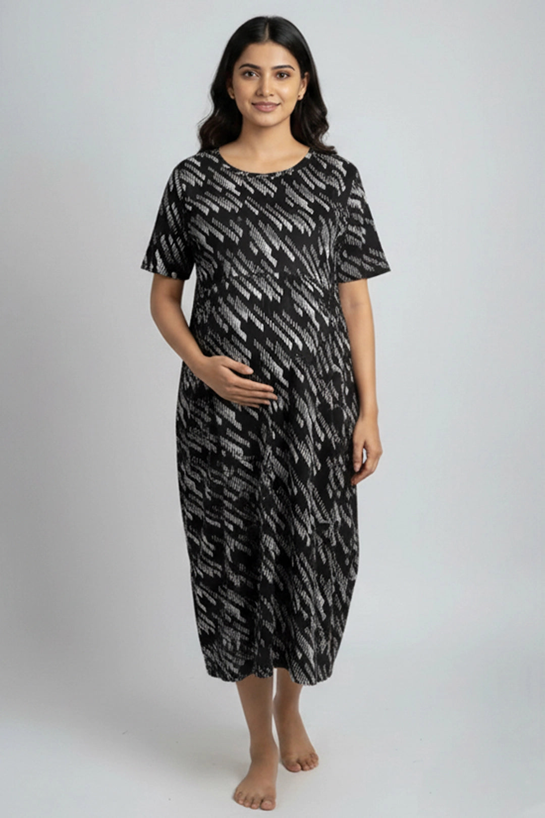 Mono Line Zipless Feeding Gown is where softness meets simplicity — thoughtfully crafted for slow mornings, relaxed afternoons, and every moment in between. Designed without zips or fuss, this piece gently supports you through pregnancy, postpartum, and nursing days, offering unmatched comfort with a quiet elegance.