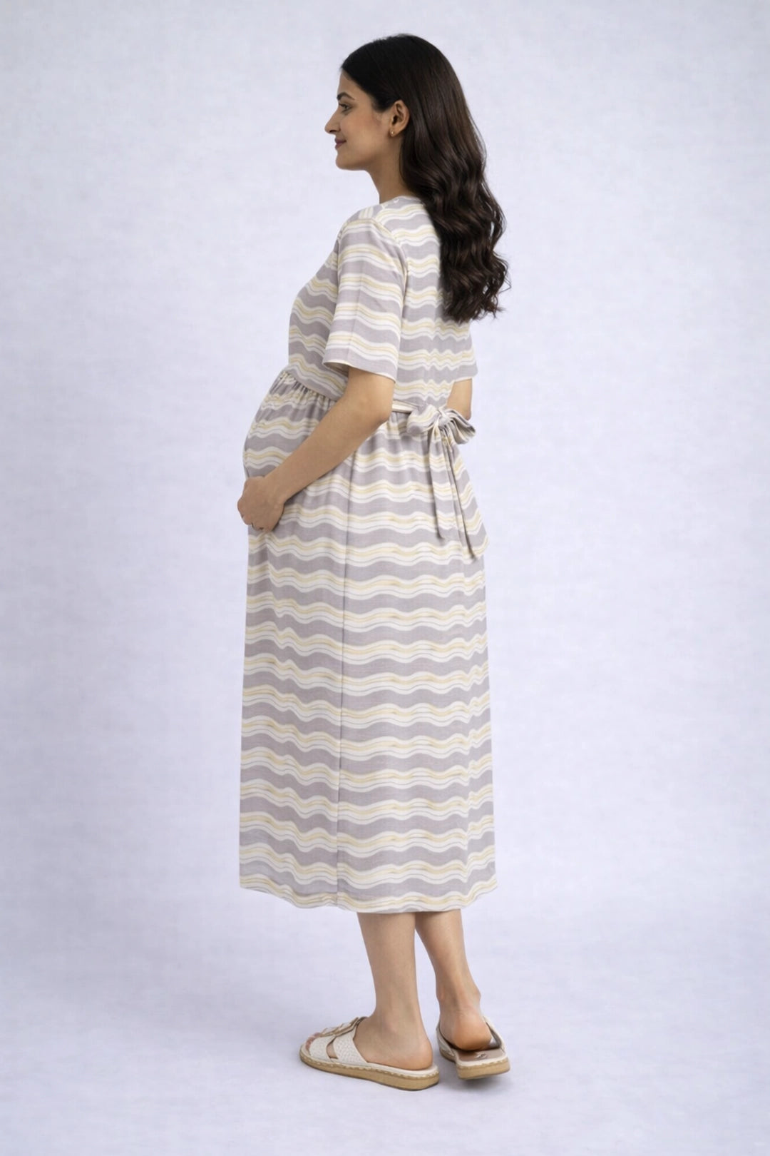 Sunlit Waves zipless feeding gown – Sand Grey is where softness meets simplicity — thoughtfully crafted for slow mornings, relaxed afternoons, and every moment in between. Designed without zips or fuss, this piece gently supports you through pregnancy, postpartum, and nursing days, offering unmatched comfort with a quiet elegance.
