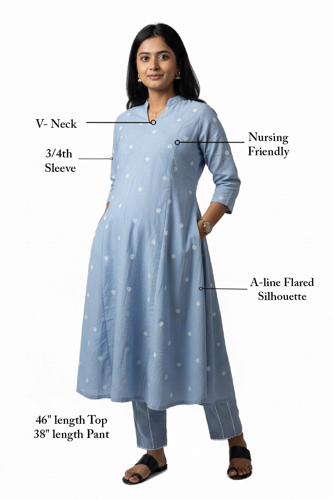 • Top Length: 46" length, offering ease of movement and modest coverage, Pants Fit: 38" length, Straight-fit pants with a elasticated waistband at back and tie-up a front for all-day ease.