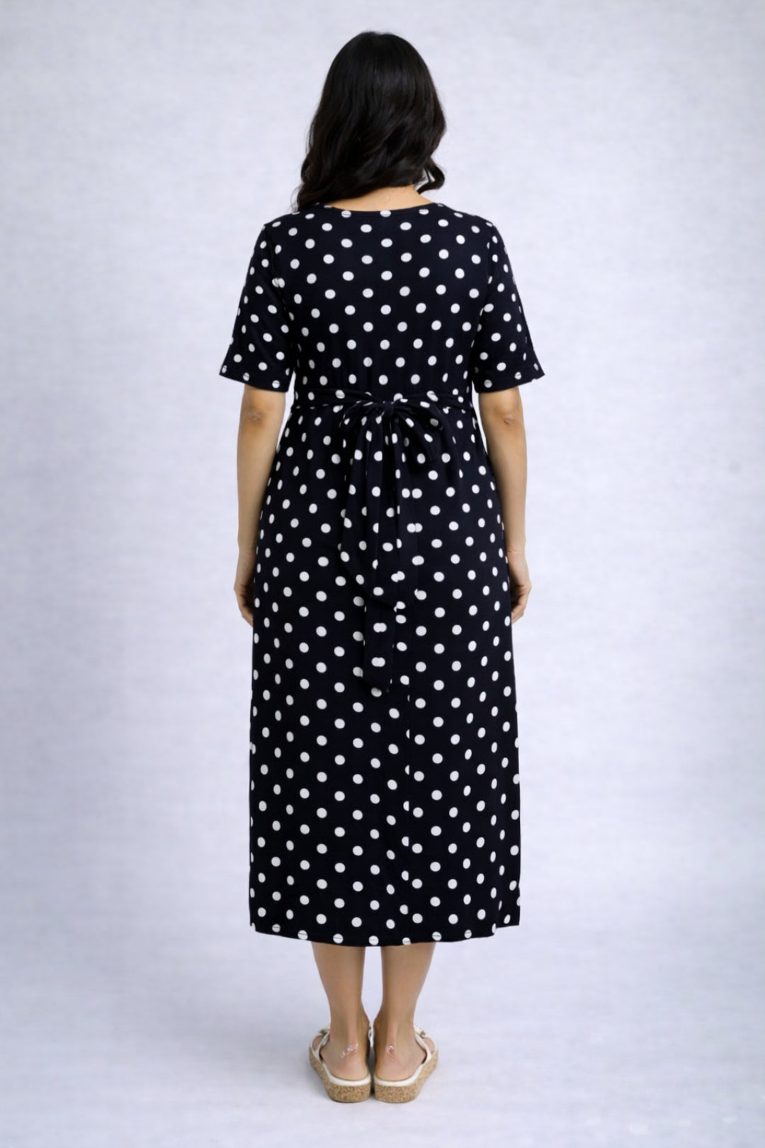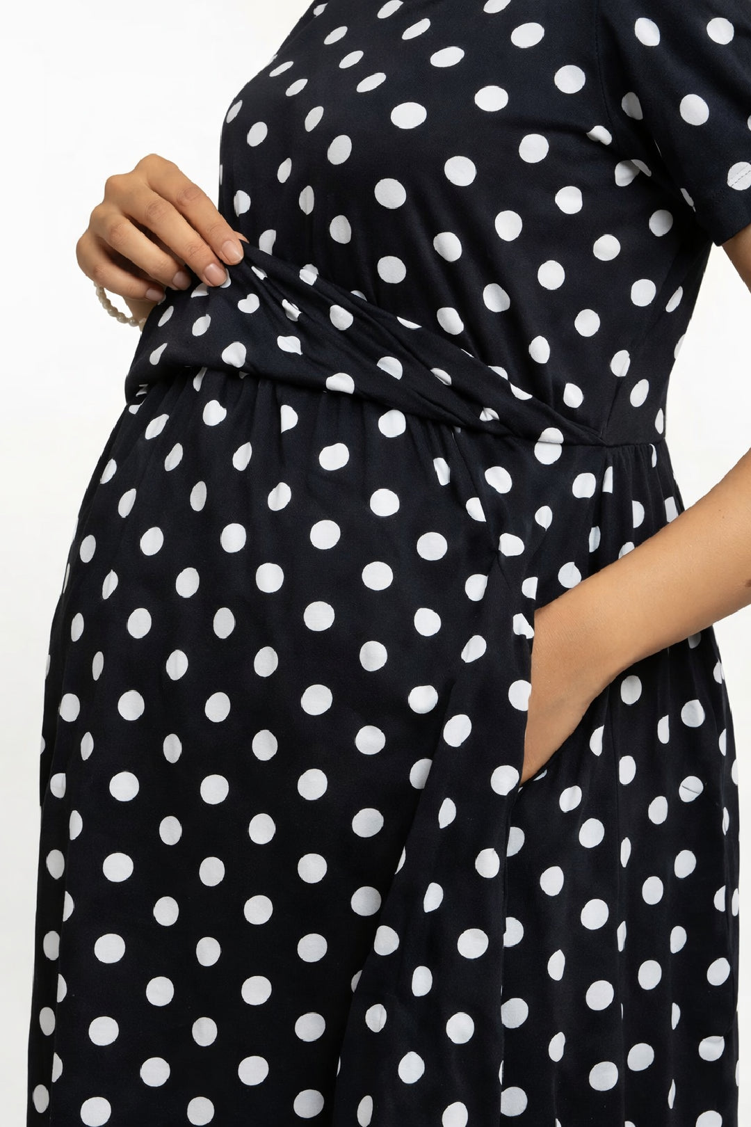 Blackberry Polka zipless feeding gown – Jet Black is where softness meets simplicity — thoughtfully crafted for slow mornings, relaxed afternoons, and every moment in between. Designed without zips or fuss, this piece gently supports you through pregnancy, postpartum, and nursing days, offering unmatched comfort with a quiet elegance.