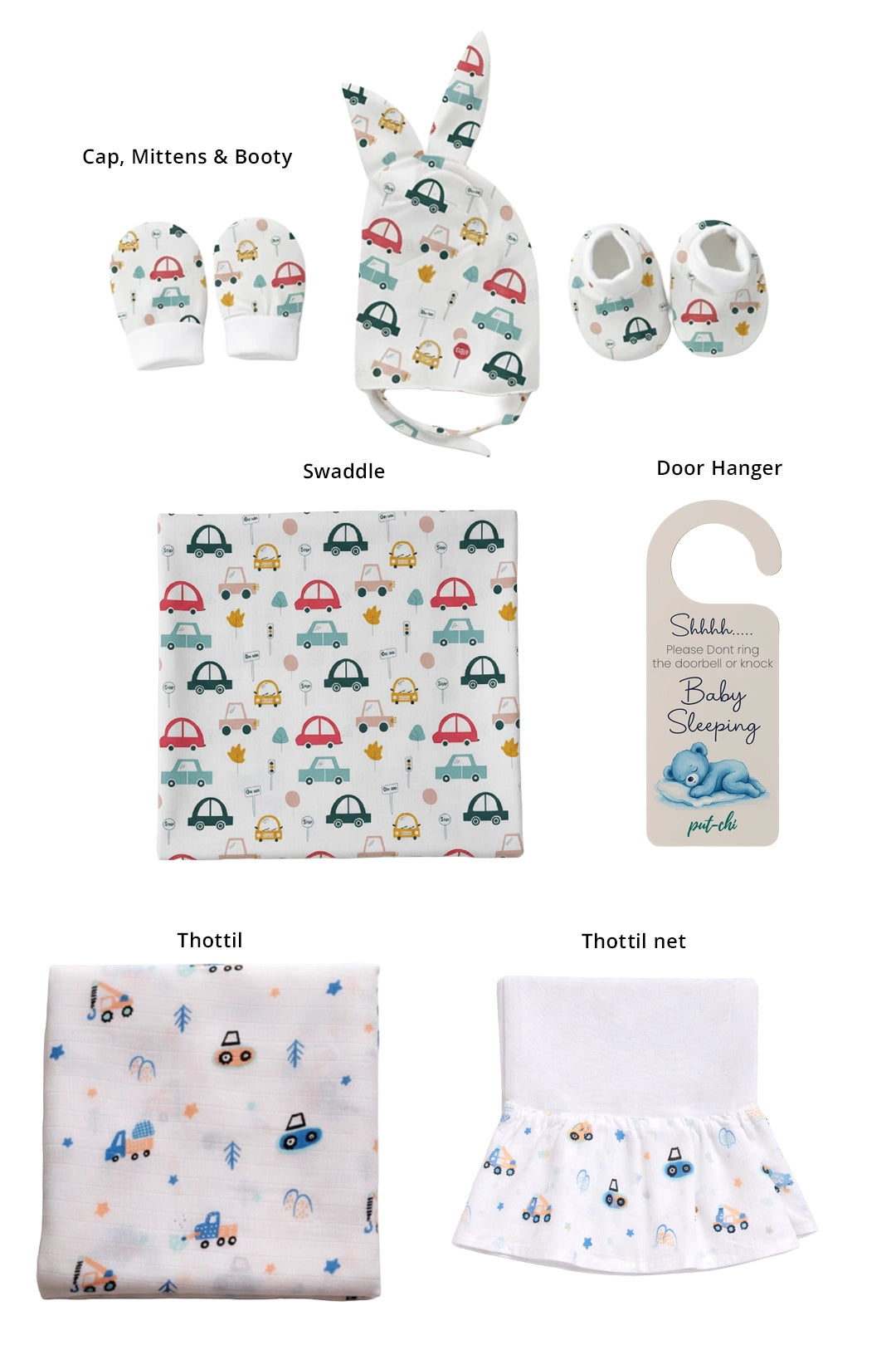 100% Muslin Cotton (for swaddle, thottil, mittens & booties)