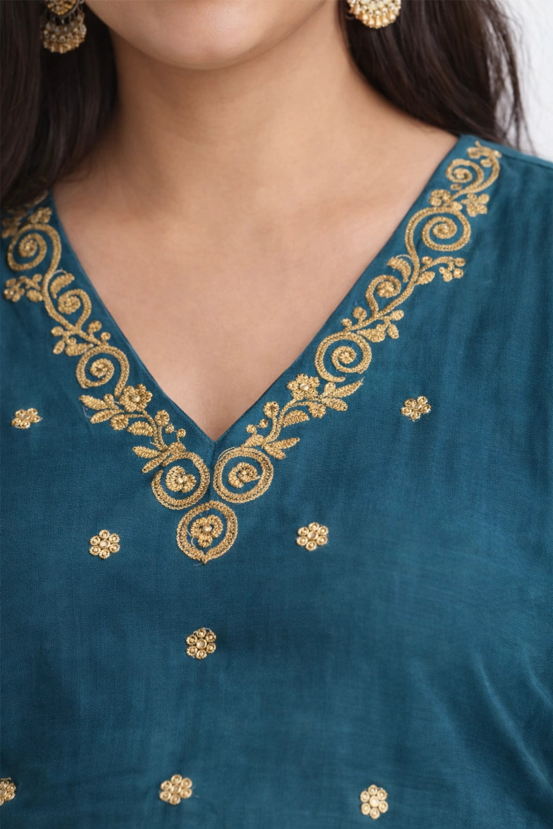 • Neckline: Embroidered V-neck with intricate threadwork and brass-tone motifs